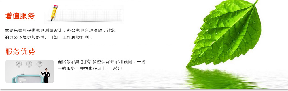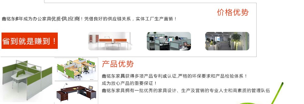深圳市鑫銘東家具有限公司專業(yè)銷售各類辦公家具!產(chǎn)品涉及多種系列,如:班臺、班椅、屏風、會議桌、會議椅、辦公沙發(fā)、茶幾、辦公桌、文件柜、電腦桌椅、各式餐臺、餐椅、書柜等辦公家具。 鑫銘東家具擁有一批優(yōu)秀的家具設(shè)計、生產(chǎn)及營銷的專業(yè)人士和高素質(zhì)的管理隊伍。銘東家具以"先難后易"之戰(zhàn)略,在產(chǎn)品結(jié)構(gòu)、產(chǎn)品質(zhì)量及服務(wù)水平方面,均推陳出新,力求完善,精益求精。使我們的產(chǎn)品質(zhì)量保持在國內(nèi)外家具潮流的先進水平,力求滿足客戶的特殊需求。鑫銘東家具多年來致力于環(huán)保、實用家具的設(shè)計與開發(fā),集生產(chǎn)、銷售、服務(wù)于一體。本著"以人為本"的設(shè)計理念,大量開發(fā)符合人體工程學的各種產(chǎn)品,以"誠信為本"的質(zhì)量方針,真材實料,認認真真做產(chǎn)品,實實在在做人。鑫銘東家具更致力于創(chuàng)造"零維修率"的制造境界,實現(xiàn)"沒有維修的服務(wù)才是最好服務(wù)"的口號》了解更多